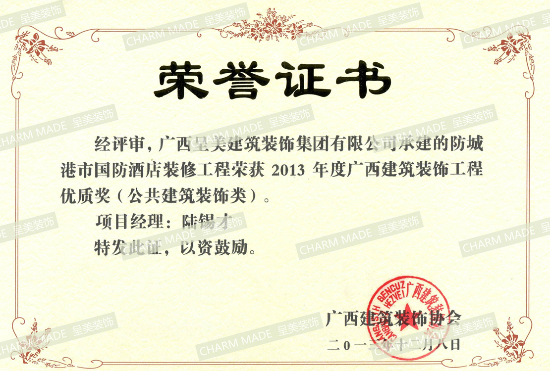 2013年 建筑工程優(yōu)質(zhì)獎(jiǎng) (國(guó)防酒店項(xiàng)目)