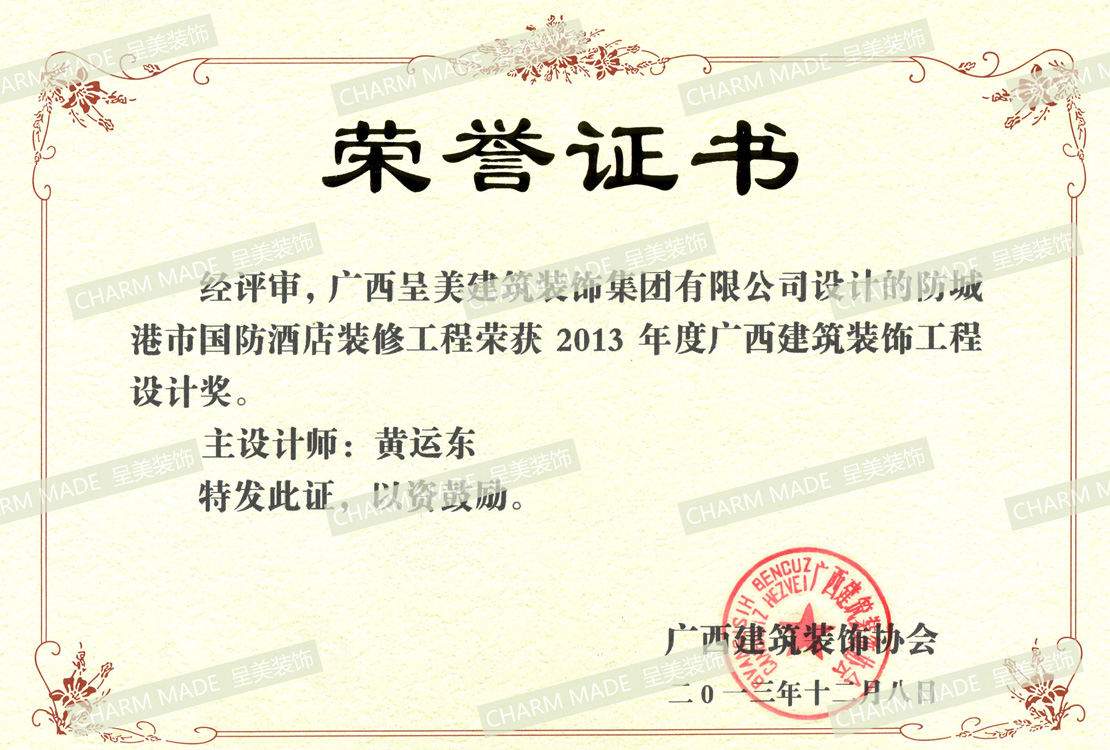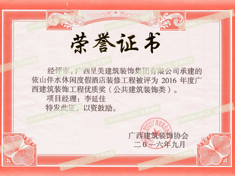 2016年度廣西建筑裝飾工程優(yōu)質(zhì)獎(jiǎng)(依山伴水酒店項(xiàng)目)