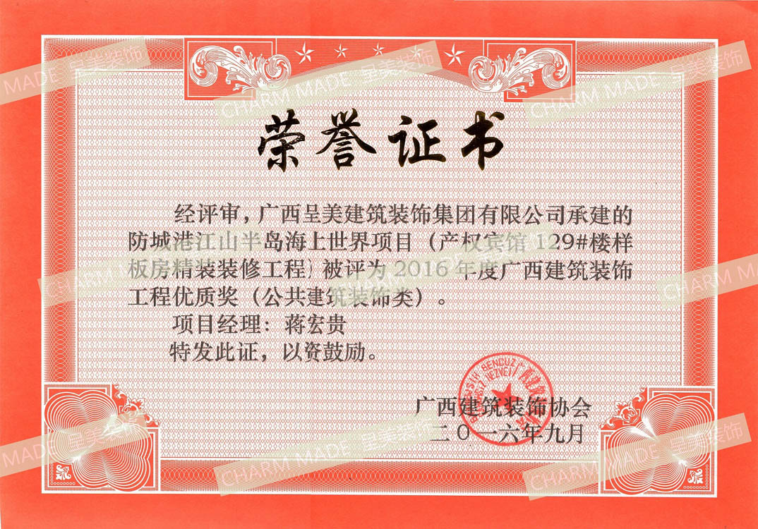 2016年度廣西建筑裝飾工程優(yōu)質(zhì)獎(jiǎng)(海上世界項(xiàng)目)